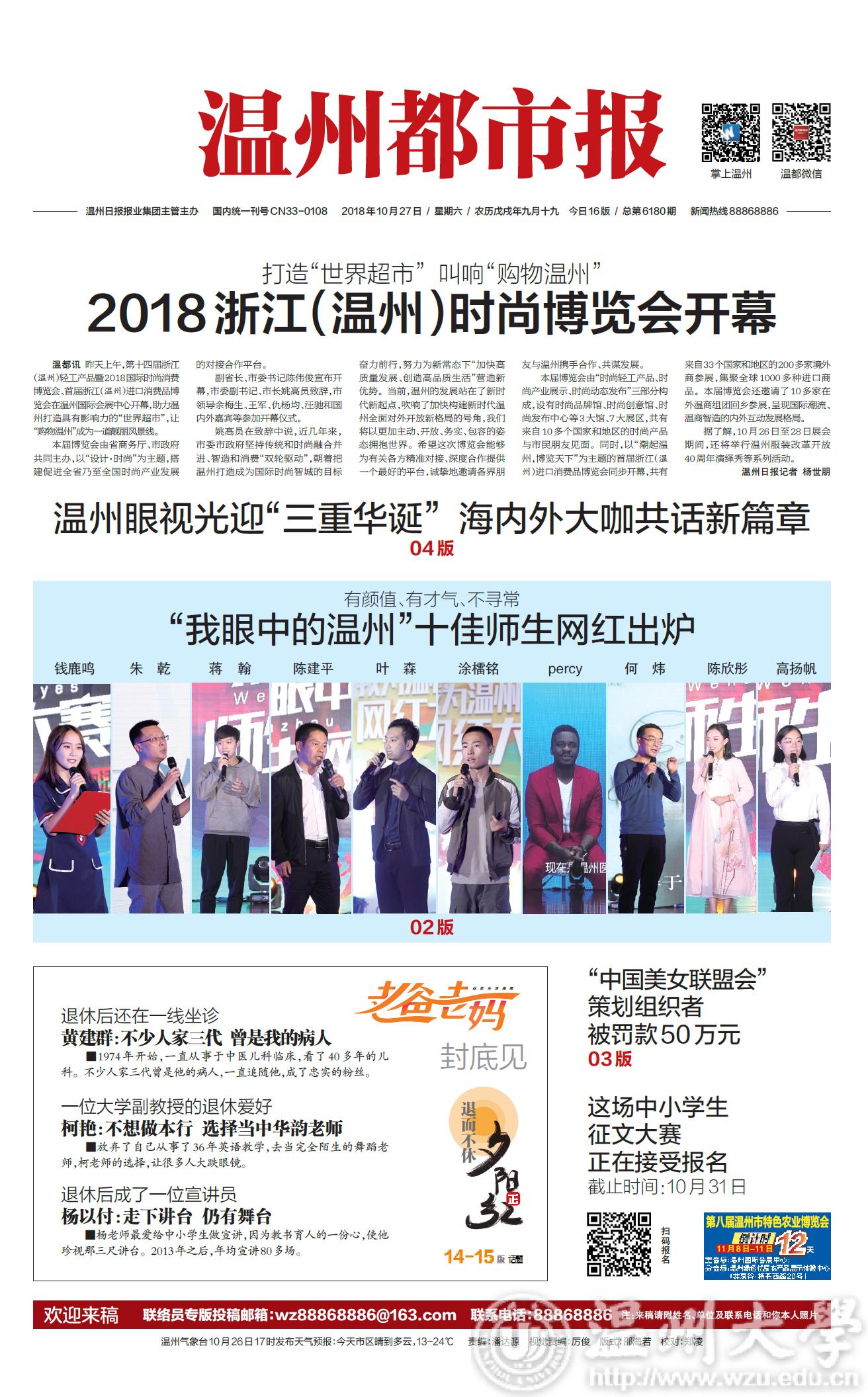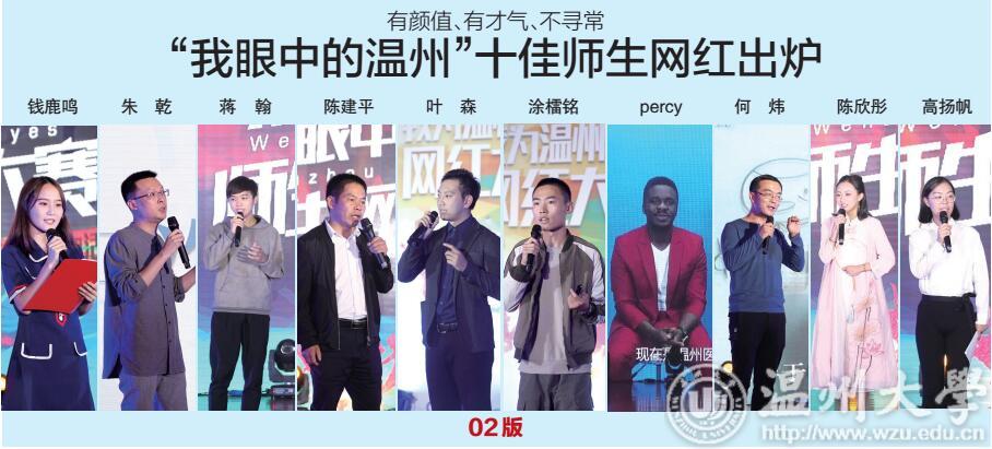 温都讯 昨天下午 2 时 30 分,“我眼中的温州”师生网红大赛暨网络文化进校园活动在新澳门六合彩 北校区举行。师生网红大赛以“我眼中的温州”为主题,是“我为温州代言”网红大赛的专场比赛之一。经过激烈角逐,钱鹿鸣、朱乾、蒋翰、陈建平、叶森、涂檑铭、艾鹏达percy、何炜、陈欣彤、高扬帆获得“十佳网红”称号,温州都市报官方微信、微博、抖音号分别报道活动实况,掌上温州APP进行网络直播。