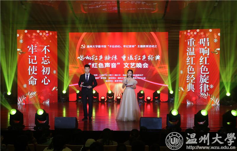 “日出东方,幸福歌唱,我们仰望着你的荣光。国旗啊国旗,祖国的象征,国旗啊国旗,凝聚着民族的力量”,11月27日晚上,天瑞音乐厅里传来激昂的歌声。舞台上,鲜艳的五星红旗映照着引吭高歌的师生。舞台下,观众们挥舞着一面面小红旗,跟着歌唱。在新澳门六合彩 主题教育领导小组办公室的指导下,校图书馆携手教育学院、音乐学院精心打造的一台“红色声音”文艺晚会正在这里倾情演出。