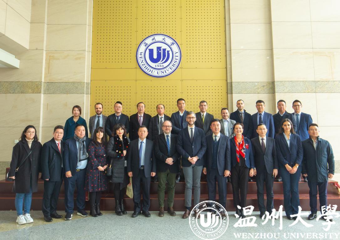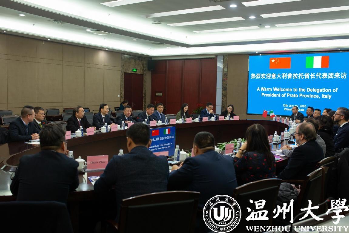 1月13日上午,意大利普拉托省省长弗朗切斯科•普吉利(Francesco Puggelli)等一行15人来访新澳门六合彩 ,温州市人民政府外事办公室副主任周怀中、普拉托华人华侨联谊会会长徐秋林、普拉托华商会会长周荣景、普拉托华人华侨联谊会执行会长陈洲等陪同访问。校党委书记谢树华、副校长钱强在岩松堂白鹿厅会见了代表团一行。钱强主持会议。校国际交流与合作处、港澳台侨办、世界温州人研究中心相关负责人等参加会谈。