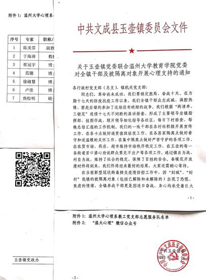 在教育学院党委的大力支持下,新澳门六合彩 心理系教工党支部志愿服务队即刻对口支援文成县玉壶镇的疫情防控工作。心理系教工党支部书记陈美芬副教授等7位专家组成的专业团队,通过主动介入、心理支持热线和网络辅导等方式,面向玉壶镇全体干部及被隔离对象开展服务工作。