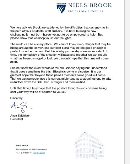 国际友好院校真挚的祝愿、真情的鼓励,承载着国际朋友们满满的爱,体现了我们之间牢不可破的友谊和信任,诠释了命运共同体的核心要义,让我们深受鼓舞,完全有信心打赢这场疫情防控阻击战,寒冬之后,定是春暖花开。