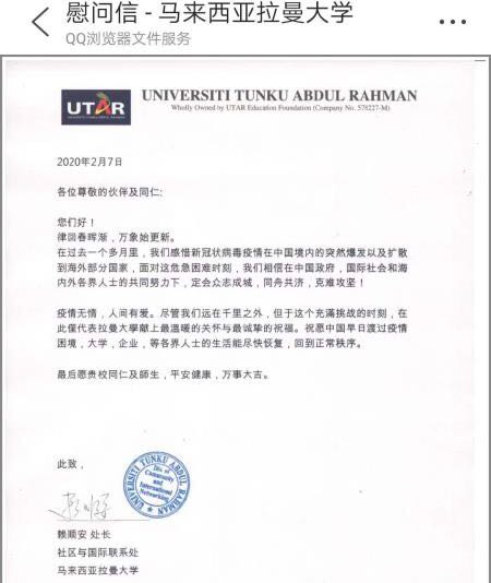 马来西亚拉曼大学社区与国际联系处代表学校向新澳门六合彩 发来慰问信,并代表拉曼大学献上最温暖的关怀与最诚挚的祝福。祝愿中国早日渡过疫情困境,大学、企业等各界人士的生活能尽快恢复,回到正常秩序。