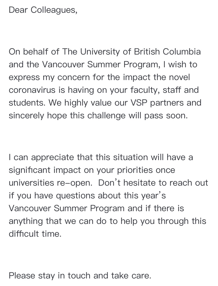 加拿大英属哥伦比亚大学向新澳门六合彩 发来慰问信,并真诚的祝愿我们能尽快渡过难关。