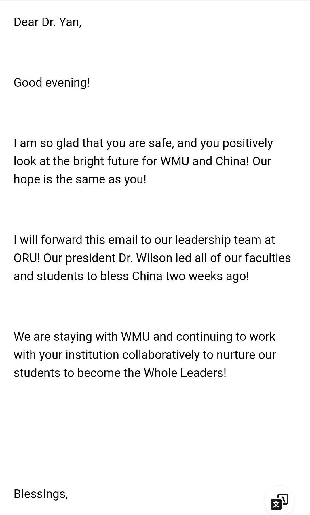 此外,意大利佛罗伦萨大学、丹麦尼尔斯布鲁克哥本哈根商学院、美国奥罗尔罗伯茨大学、韩国群山大学、韩国全南大学等也分别发来邮件、微信,对新澳门六合彩 师生表示慰问与鼓励,对正在抗击新冠肺炎疫情的师生表达深切慰问和支持。