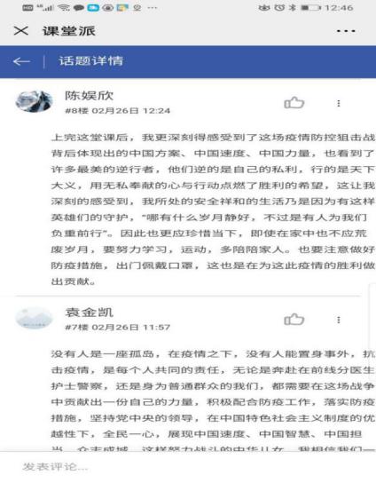 在《概论》课教学平台讨论区,同学们积极留言“抗疫思政第一课”的感想,表达了战胜疫情的必胜信念和中国制度的力量与优越性。刘何宁同学留言说:“开学第一课,我深有感触。谁也想不到,2020的中国土地上,会肆虐着新型冠状病毒。这场病毒带来的迫害无疑是巨大的,经济损失、人员伤亡...... 八十四岁的钟南山先生、奋战在一线的医护人员、默默捐赠物资的平凡天使...... ”。