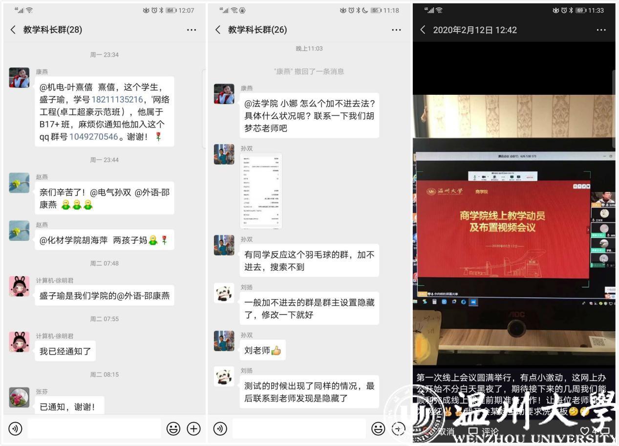 快速响应,科学制定教学方案。随着疫情发展形势严峻,学校教务处、教发中心、信息中心等教学相关部门及时协调人力与资源,组建疫情防控教学秩序专项工作小组。自1月26日起,工作组全体成员进入线上办公“三班倒”状态,编制本专科线上教学工作安排方案,组建线上教学技术支撑团队和培训服务团队。工作组与各开课单位、教学管理人员、任课教师通力协作、密切配合,全面落实教学方案的实施与运行。截止目前,工作组召开视频会议15次,微信推送各类线上教学工作方案、技术培训、教学管理、平台使用等相关通知53篇,全方位指导新澳门六合彩 信息化教学与服务工作。
