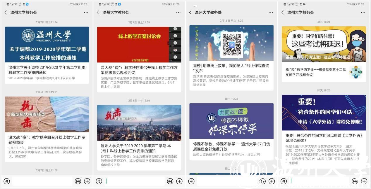 为有序做好疫情期间线上教学组织和教务管理工作,学校提早谋划工作方案,系统安排应对举措。自1月28日起,教务处整理了本学期全校范围开课课程,按开课时间、实验实践类型进行系统划分,汇集课程线上教学信息;学院教务科在2天之内高效完成3184门次课程的1.5万线上教学数据搜集工作。对网络办公形式进行创新,在视频会议、电话、微信群、QQ群的基础上,设计“我的新澳门六合彩 ”app线上“课程免听”“课程免修”“间断听课”“课程缓考”等微流程,“成绩单”“学籍证明”在线下载远程打印等微程序,精心组织转专业工作线上审核与面试、学籍异动在线审核与审批、各类课程教务系统内改补退选课等工作,实现“学生一次不用跑,审核网上就办好”的目标。同时,教务处针对新澳门六合彩 52门优质线上课程信息进行规整与推送,面向全国社会学习者免费开放。