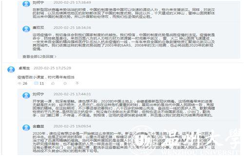 在《概论》课教学平台讨论区,同学们积极留言“抗疫思政第一课”的感想,表达了战胜疫情的必胜信念和中国制度的力量与优越性。刘何宁同学留言说:“开学第一课,我深有感触。谁也想不到,2020的中国土地上,会肆虐着新型冠状病毒。这场病毒带来的迫害无疑是巨大的,经济损失、人员伤亡...... 八十四岁的钟南山先生、奋战在一线的医护人员、默默捐赠物资的平凡天使...... ”。