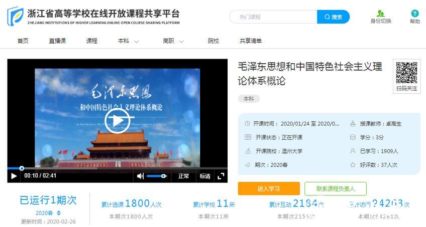 学院在巩固提升“一化六制”思政课综合改革的基础上,近年来高度重视提升思政课教师信息化能力素养。在抗“疫”期间,推进2门省级精品在线开放建设课程《毛泽东思想和中国特色社会主义理论体系概论》(以下简称《概论》)和《工程伦理与社会》在浙江省高校在线开放课程共享平台运行,另外《马克思主义基本原理》和《概论》课在智慧树在线教育平台使用。为响应教育部有关文件精神,学院将三门思政理论课程免费共享,截止2月26日,《概论》课第一期慕课省平台已有11所高校师生超过9.4万人次的访问量。