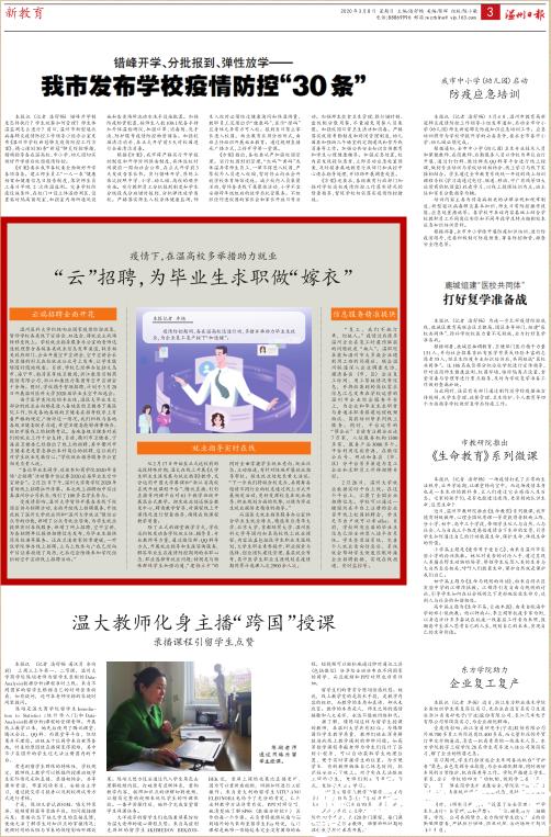 由于医学类院校的专业性,温医大毕业生大部分的就业去向都是进入各地区的卫健委下属医院工作,但是各地各级的卫健委在招考程序上有着严格的规定。 “面对这一情况,我们积极与各地各级卫健委联系沟通,希望卫健委能够特事特办,组织开展线上的招聘考试。各地各级卫健委对我们的就业工作十分支持,目前,衢州市卫健委,宁海县卫健委已经推出了线上的招聘,其中衢州市卫健委更是紧急推出本科岗位的招聘,这让我们对学生就业充满信心。”学校就业指导服务办公室相关负责人说。