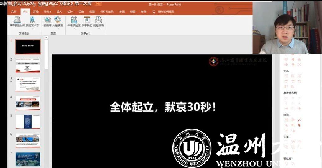 “全体起立,向本次疫情中英勇牺牲的医务人员和不幸去世的患者默哀。”2月24日上午,浙江商业职业技术学院马克思主义学院陈智鹏老师在新学期给学生讲授的第一课,师生们隔着电脑屏幕,通过直播网络连线,进行了默哀仪式。