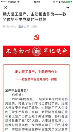 学校组织部发出“助力复工复产,主动担当作为——致全体毕业生党员的一封信”。信中说:“大事难事见担当,危难时刻显本色”,作为新澳门六合彩 学子中的先进榜样,学校殷切希望全体毕业生党员充分发挥引领作用,主动担当作为,让党旗在防控疫情和企业复工复产第一线高高飘扬!