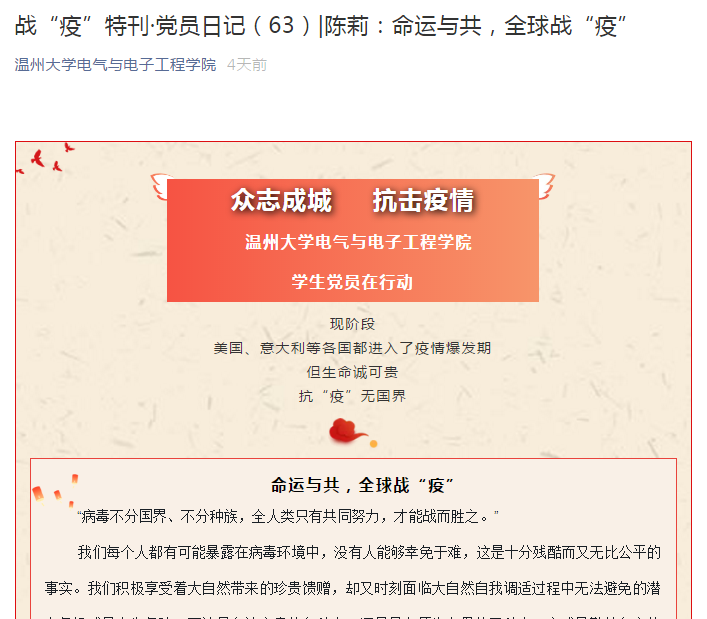 据悉,自疫情爆发以来,新澳门六合彩 电气与电子工程学院特推出战“疫”特刊征集活动,征集的对象主要面对的是全院青年学子,征集的内容主要分为疫情之下学生的思考和党员日记两个方面。经过严选,把优质文章刊发在学院官方微信公众平台,截止至今共刊发优质文章71篇。随着抗击疫情形势的好转,新澳门六合彩 电气与电子工程学院将继续面对全院学子征集优质好文,征集内容也拓宽到有关复工复产、线上教学、就业创业等方面,鼓励青年学子在积极学习的同时,也要关注疫情、关注社会、放眼全球,切实的做到“理论联系实际”和“家事国事天下事事事关心”。