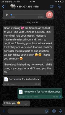 今年2月初,由于疫情原因,直接导致2020-2021年度新澳门六合彩 外派老师不能按时成行。考虑到当时的疫情,新任老师将无法赶上3月份意大利春季开学。“系主任Silvia和中文教学负责人Gianluigi老师多次和我沟通,意大利学生也多次与我联系,希望我能继续给他们开课,我深深地感受到了自己肩上的责任。”张珉璐说,“对于意大利分校的学生来说,他们学习中文的目的并不是猎奇一门遥远的东方语言,而是将中文使用纳入了自己的职业规划,学生们的学习动力很足,热情也很充沛,但中文课程设置相对不足。作为对外汉语教师,我们就是要利用有限的教学时间,取得最大化的教学效果。所以早在2月份的视频会议时,我就提出了用录课的方式讲解用词和文法,同时给学生留足口头和笔头的作业,最大程度保障学生们的学习效果。”