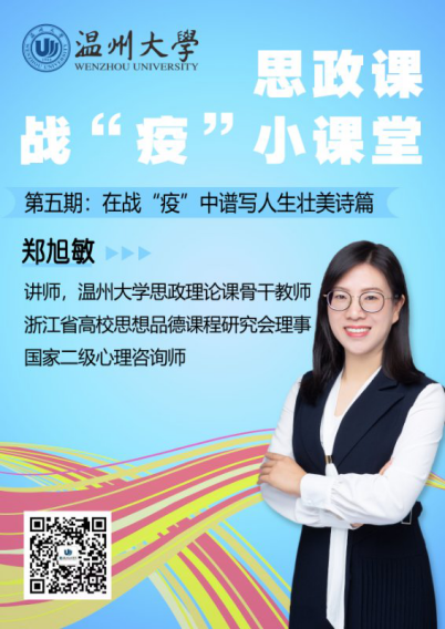 本期推出马克思主义学院郑旭敏老师思政课战“疫”小课堂:在战“疫”中谱写人生壮美诗篇。防控疫情是没有硝烟的战场,但有生死考验。面对疫情生死考验,人们为了他人的生命安全选择逆行。践行“既珍爱自己的生命,也爱护他人的生命”的生命价值基本内涵。面对疫情困境,人们用乐观进取彰显生命价值,使个体生命价值从“活着”升级为“活得有品质”,从自然生命向精神生命转变。直面疫情防控,人们选择勇担责任,在社会和他人之中成长生命价值。抗击疫情的行动不仅生动地向世人展示出生命价值的多层内涵,更深刻揭示了人们是如何在战疫行动中谱写生命的壮美诗篇。