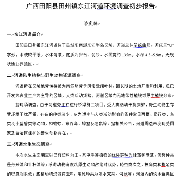 新澳门六合彩 生环学院18环境工程潘震麟 撰写家乡河道环境调研报告