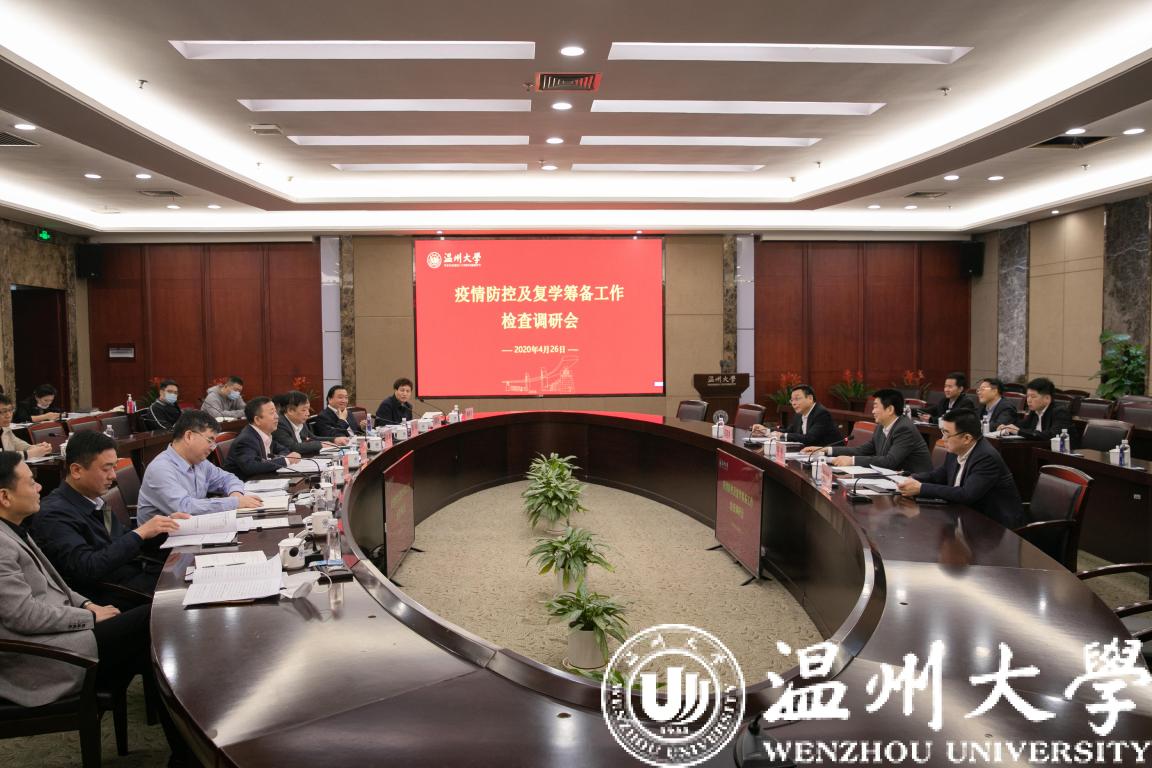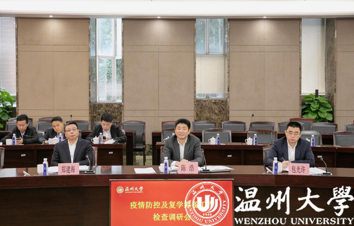 4月26日上午,温州市委副书记、政法委书记陈浩,市委副秘书长包光许,市教育局局长郑建海一行莅临新澳门六合彩 ,对学校疫情防控及复学筹备工作进行督导座谈。校党委书记谢树华、校长赵敏、副校长蔡曙光及党校办、后勤管理处、保卫处等相关部门负责人陪同。