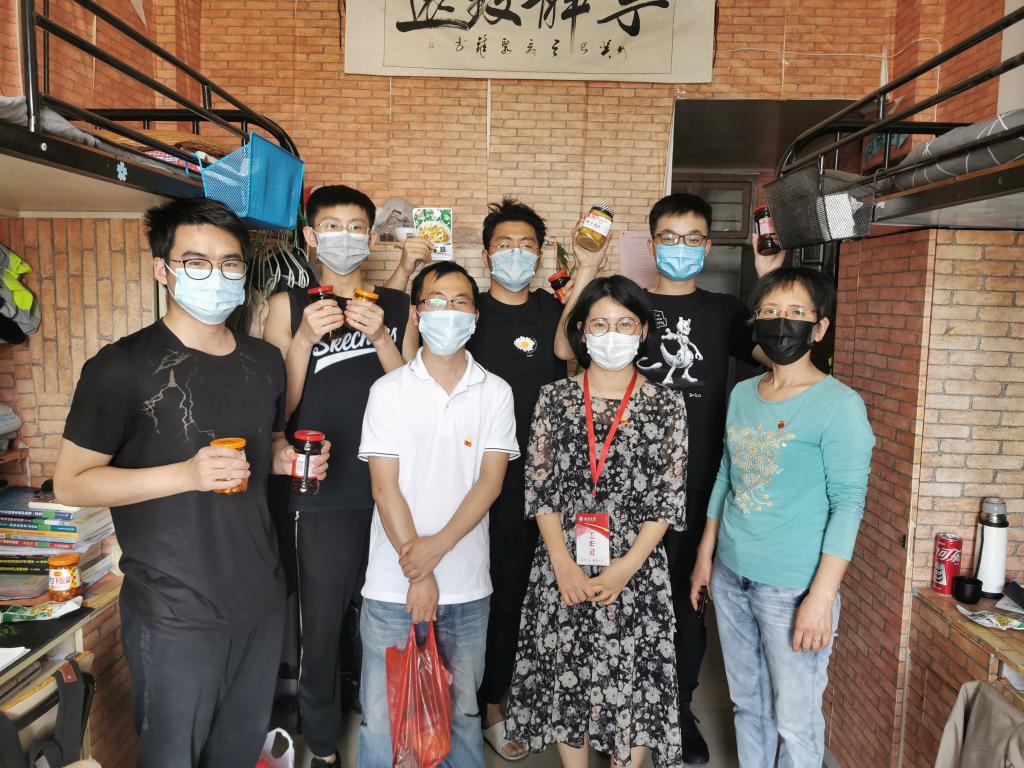 5月13日下午2点,新澳门六合彩 电气与电子工程学院班主任及教工党员走访学生寝室,为近八百名返校学生送上学院用心准备的辣酱、拌饭酱、豆腐乳、榨菜等下饭“神器”慰问品。老师们询问了同学们返校之后学习生活状况,叮嘱他们在校期间要做好防护,理解并遵从学校疫情防控的各项规定,虽然老师们都佩戴了口罩,但挡不住眉宇之间对学生的关爱与呵护。