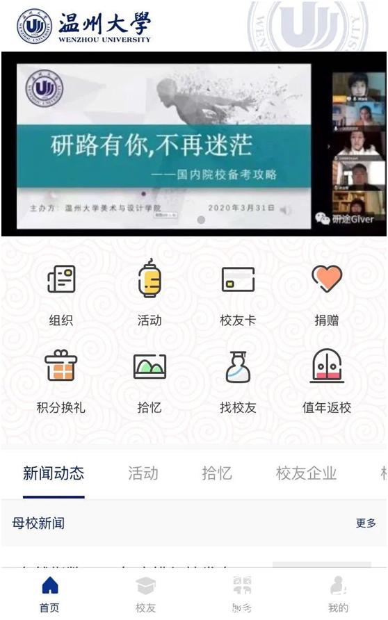 云返校。推出实名认证校友社群。关注新澳门六合彩 校友总会微信公众平台,点击校友社群,实名注册校友信息,可开启寻友之旅,与故友在“云端”相遇。