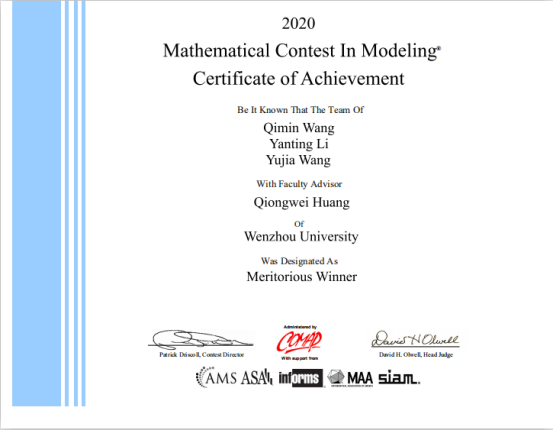 近日,2020年美国大学生数学建模竞赛成绩揭晓。新澳门六合彩 机电工程学院18工业工程班的王启敏、李艳婷和汪雨佳三位本科生组成的参赛团队,在激烈的角逐中脱颖而出,荣获一等奖。这也是新澳门六合彩 本科生在国际性数学建模大赛中再一次获奖。