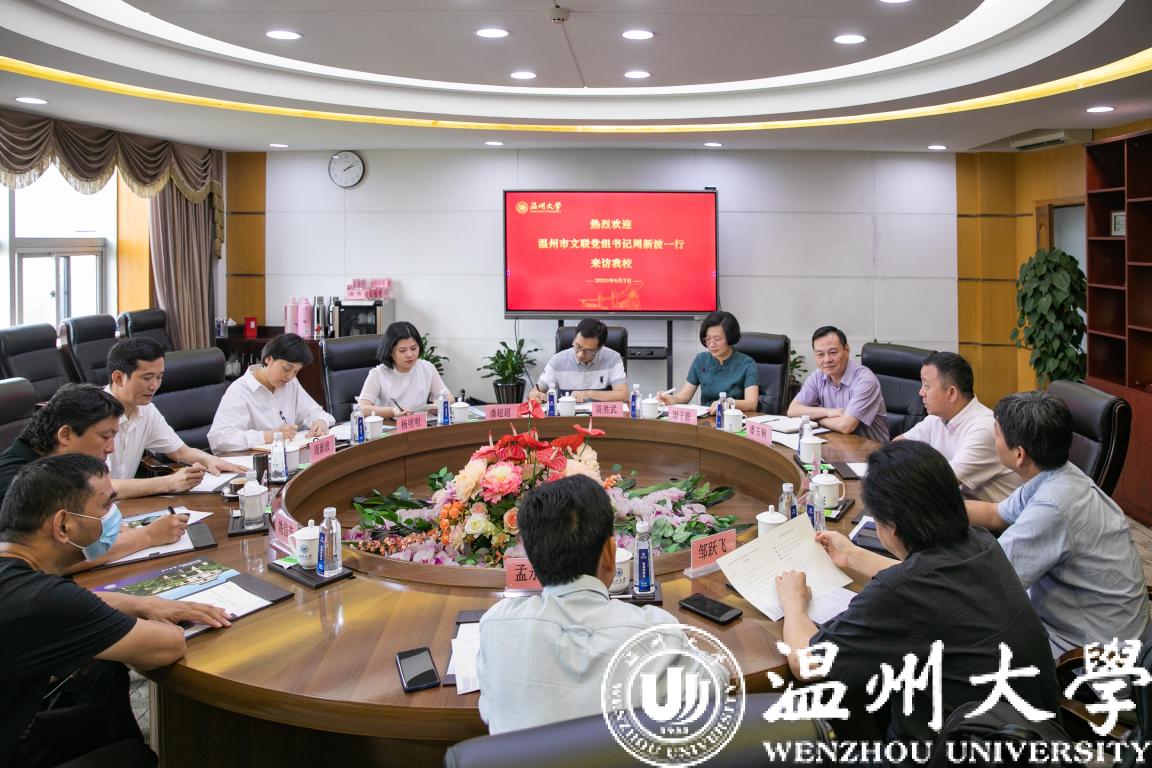 6月2日下午,温州市文联党组书记周新波,文联主席建议人选杨明明,副秘书长、市美协主席张成毕等一行来校交流座谈。校党委书记谢树华,党委副书记庄兴忠,党委委员、宣传部部长潘玉驹出席座谈会。