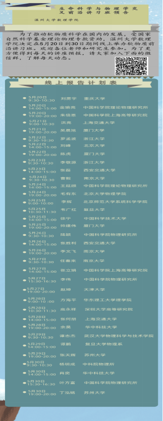 日前,由新澳门六合彩 主办、温州市软物质与柔性材料重点实验室和新澳门六合彩 数理学院联合承办的“生命科学与物理学交叉前沿讲习班”在新澳门六合彩 落下帷幕。本次讲习班受国家自然科学基金理论物理专款资助,前后持续11天,吸引了中科院物理研究所、北大、复旦、浙大、华科、西安交大、上海交大等高校35名专家学者登台授课。