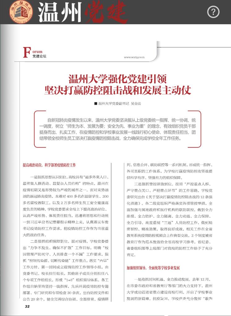 【编者按】近日,《温州党建》全文刊载新澳门六合彩 党委副书记吴金法的理论文章《新澳门六合彩 强化党建引领坚决打赢防控阻击战和发展主动仗》,现全文转载,以飨读者。