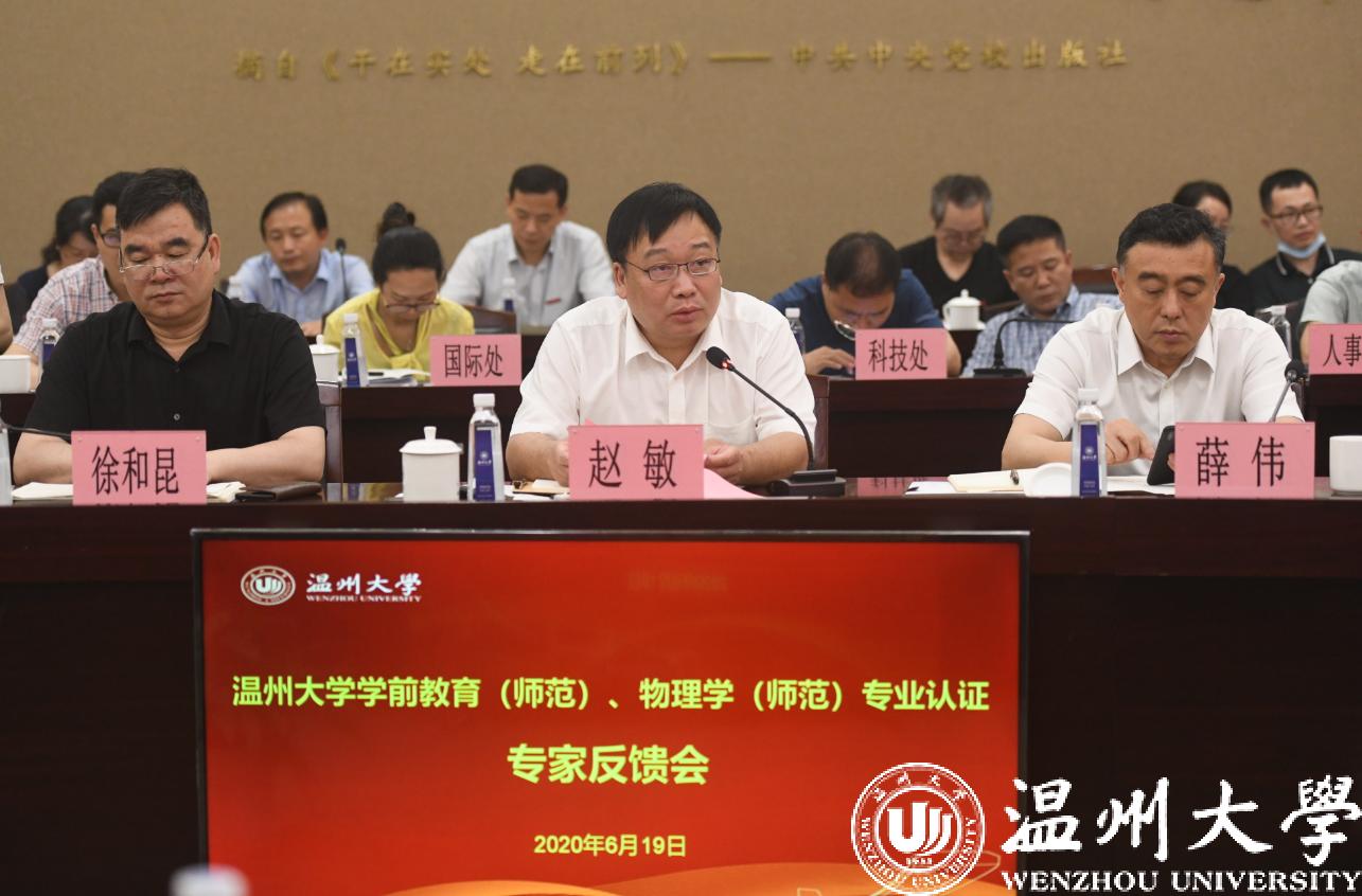 赵敏校长讲话。他首先代表学校对各位专家和教育厅领导的辛勤工作表示衷心的感谢和崇高的敬意,也对学前教育和物理学专业全体师生表示亲切的慰问和深深的谢意。针对专家组在反馈中提出的问题和不足,赵校长谈了三点认识:一是持续改进,继续提升两个专业建设内涵;二是以点带面,推动全校师范类专业建设;三是整体提升,推动学校特色内涵发展。