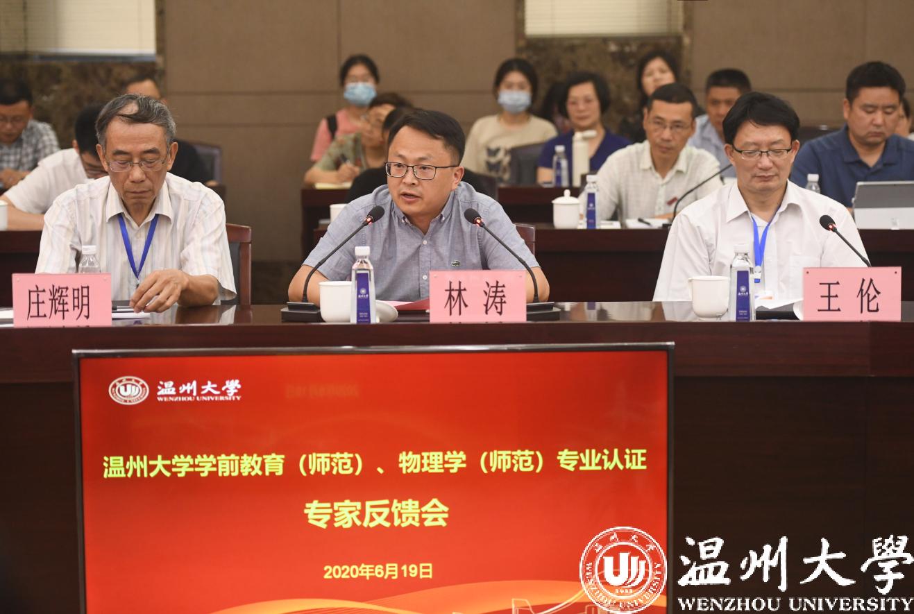 认证专家组成员分别是:学前教育专业专家组组长庄辉明教授、扬州大学教育科学学院陈秋苹教授、浙江师范大学国际儿童研究院秦金亮教授、丽水学院幼儿师范学院胡锋吉教授、杭州观成幼托园杨蓉总园长,物理学专业专家组组长安徽师范大学王伦教授、浙江师范大学赵雷洪教授、淮阴师范学院周平教授、湖州师范学院生命科学学院李彬教授、原浙江省教育厅教师工作处李敏强处长。浙江省教育厅教师工作处林涛副处长,新澳门六合彩 赵敏校长、薛伟副校长、徐和昆副校长,党校办等各有关职能部门负责人、两个专业所在学院的领导和教师代表、其他承担师范生培养学院的相关代表参加了会议。会议由专家组王伦组长主持。