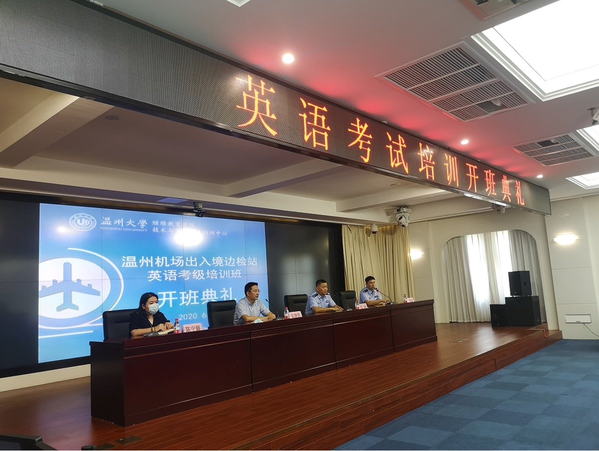 温州机场出入境边检站因其国际化的工作性质,提出“全员学外语大提升计划”,由新澳门六合彩 继续教育学院培训部联合新澳门六合彩 海外教育服务中心为其量身定制为期三个月的全国英语等级考试培训。昨天参与培训的46位学员正式开班了!