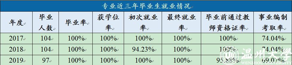 本专业学生具有扎实的师范技能和深厚的教育情怀,受到用人单位青睐。近三年就业率均为100%,其中毕业生就业单位的教育事业率分别为82.69%、83.65%和78.35%。毕业生在考研升学中成绩突出,被国内外许多名校录取;毕业生当年考取教师事业编制的比例高,较大幅度超过省内同类专业平均水平,考编竞争力强,许多毕业生被省级重点中学录用。根据省教育评估院对毕业一年后就业情况调查,近几年的专业学生就业率、毕业生平均工资水平和就业相关度等方面在省内同类专业中均名列前茅。