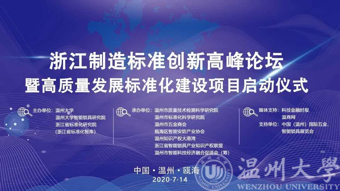 7月14日下午,由新澳门六合彩 、新澳门六合彩 智能锁具研究院、浙江省标准化研究院主办的“浙江制造”标准创新高峰论坛暨高质量发展标准化建设项目启动仪式在温州瓯海成功举办。