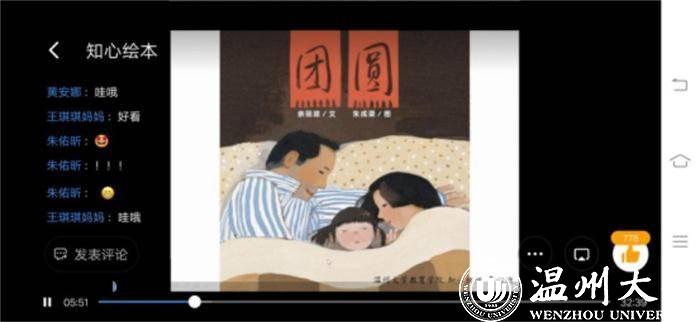 新澳门六合彩 知心姐姐实践队队长徐夏介绍:“除了在线上开展绘本课程,实践队员还积极地参与到手工制作绘本当中,从编写绘本故事到画图填色,一笔一画都注入了对孩子们的关爱。无论是绘本录制还是手工制作,每个队员都专心致志,精益求精,努力为小朋友呈现出最好的故事”。在绘本故事《团圆》的分享中,知心实践队员紧紧围绕着“团圆”这一主题将这些散落在故事中珍珠一颗一颗地串联起来,为小朋友们营造了过年团圆的和谐氛围。同时,为了让小朋友们能更好地进入绘本情景,实践队员精心设计了众多环节,如教小朋友们画汤圆、请小朋友们分享春节期间和爸爸妈妈一起做的趣事等,增强他们的参与感,加强其表达意识,锻炼其实践能力,并尝试引导孩子与其家人建立良好的依恋关系,促进其心理的健康发展。在故事的最后,与当下疫情的现状相结合,指出团圆是来之不易的,呼吁小朋友们要珍惜与家人团聚的温馨时刻。