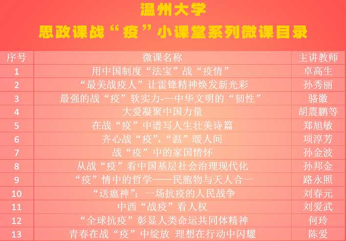 运用好疫情防控这一鲜活的思政教科书、生动的思政大课堂,宣传在以习近平同志为核心的党中央坚强领导下,全国上下齐心协力抗击疫情的重大举措、感人事迹、生动故事,教育引导学生弘扬爱国主义精神,增强中国特色社会主义道路自信、理论自信、制度自信、文化自信,新澳门六合彩 马克思主义学院集合学院教学骨干,推出思政课战“疫”小课堂系列微课。