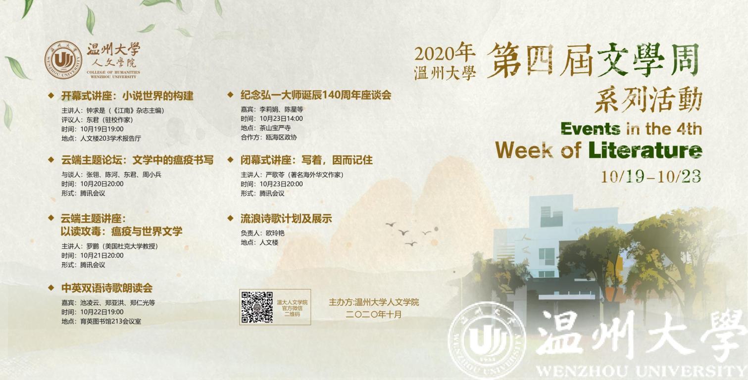 与以往不同的是,这次文学周,还将借助互联网技术,聚合全球知名学者、华文作家参与文学周活动,实现全球互动。文学周的主题论坛“文学中的瘟疫书写” ,将以云端主题论坛形式进行,著名温籍海外华文作家张翎、著名温籍海外华文作家陈河、新澳门六合彩 驻校作家东君、新澳门六合彩 人文学院副教授周小兵将参与云端研讨。