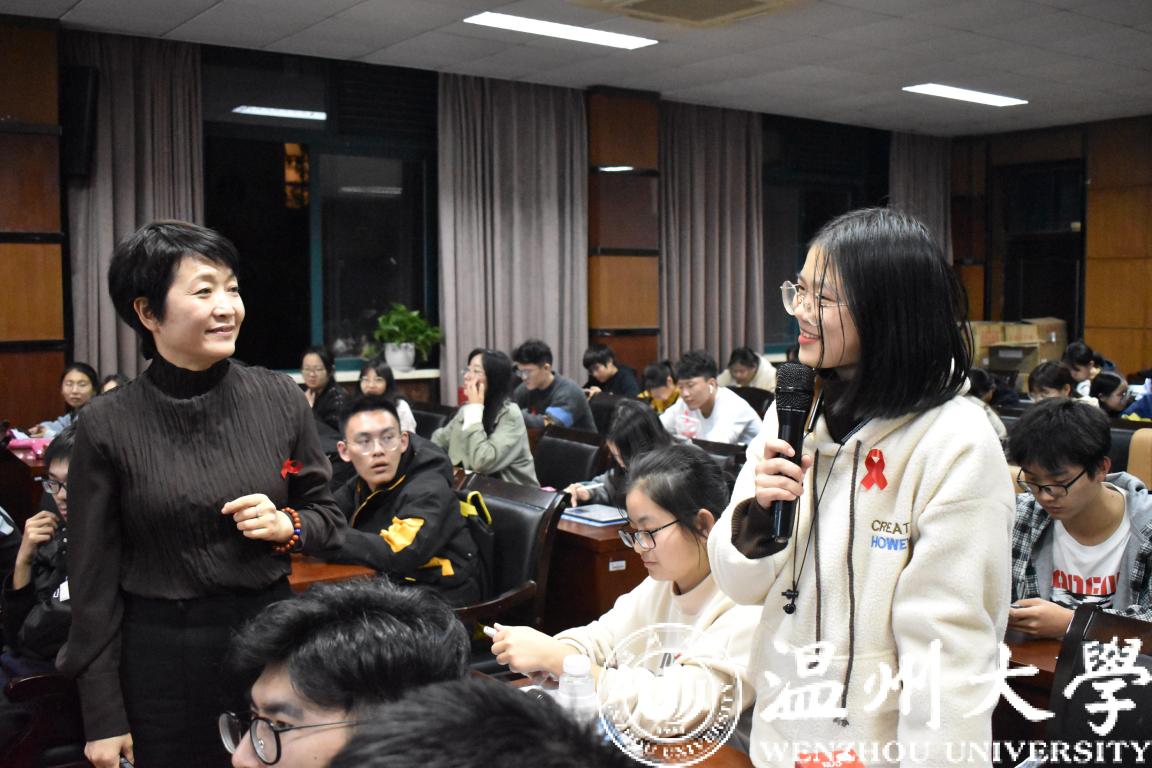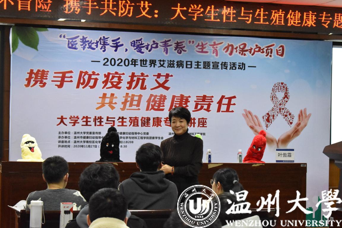 下午,为爱坚持,拒绝冒险”主题讲座在新澳门六合彩 南校区化学与材料工程学院11B-208会议室成功举办,讲座邀请了温州市健康妇幼指导中心保健科科长、副主任医师叶傲霜作为主讲嘉宾。叶傲霜老师以通俗的语言,生动真实的事例,教授了同学们许多有关性与艾滋病的实用知识,提醒同学们一定要在日常生活中注重个人健康的保护,重视血液传播潜在途径的人为阻断,养成文明健康的生活习惯,避免易感染艾滋病危险行为的发生,提升健康素养。