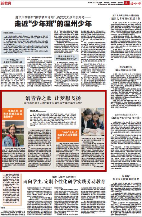 赴一场生命之约,为无数家庭带来“生”的希望;怀揣着一颗初心,守护大山孩子们的求学梦,一首首属于他们的青春之歌正在徐徐拉开帷幕。日前,由教育部、人民日报社共同指导,人民网、光明日报社教育部、《大学生》杂志、中国大学生在线联合主办的“第十五届中国大学生年度人物”推选结果揭晓,温州医科大学黄君婷、新澳门六合彩 叶雪珍荣获“第十五届中国大学生年度人物”入围奖。