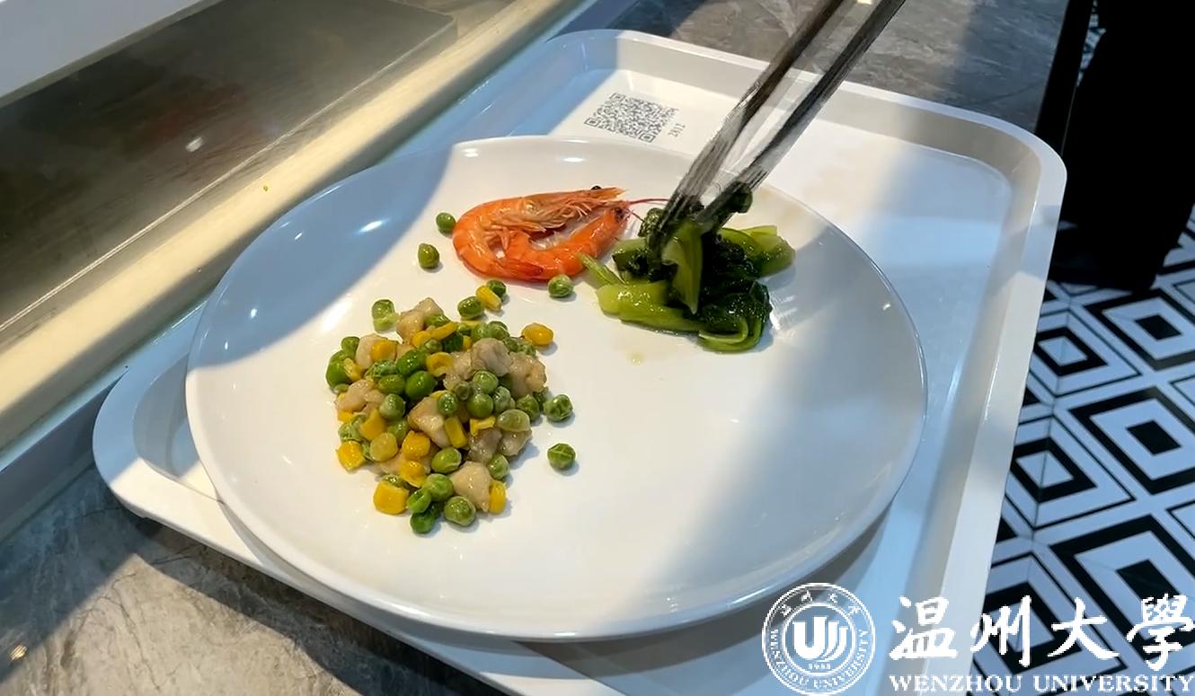在智慧餐厅里,记者根据平常的食量也为自己精心挑选了“自助餐食”。菜品包括对虾、青菜以及豌豆炒虾仁。