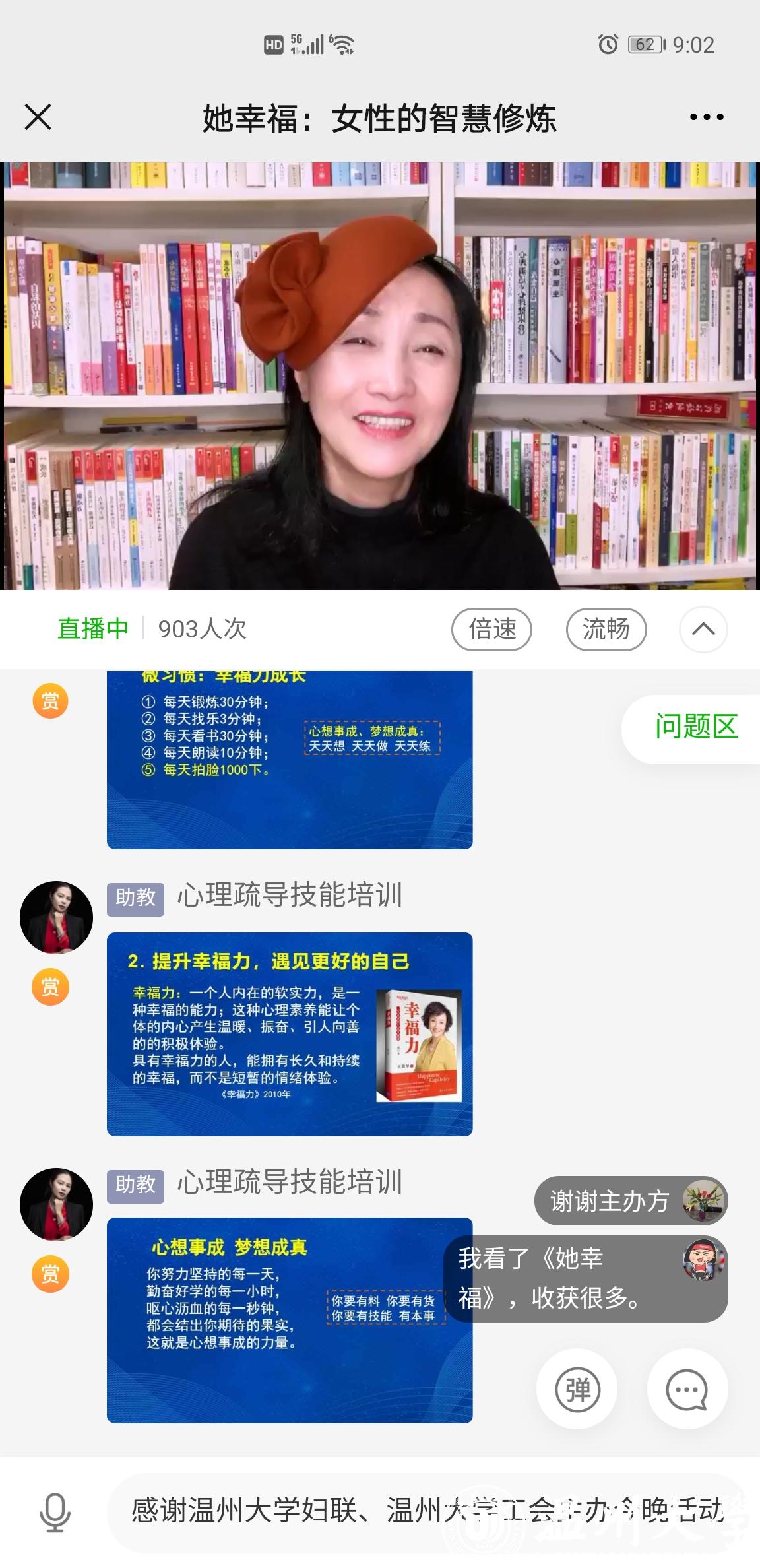 中国地质大学博士、积极心理学研究和实践专家、“中国职场幸福力”发起人和倡导者、首席幸福力导师王薇华在云端开启讲座,与新澳门六合彩 近千名女教职工共话女性如何智慧修炼,提升幸福力。王薇华老师从女性的角色意识崛起、女性的时代到来、女性经济发展等方面来说明21世纪女性角色的社会化发展历程。王老师说,女性善于沟通、富有亲和力;善良细心、乐于奉献;注重家庭、终身学习,这是女性最大的性格优势。最后王老师重点分析女性的职业心理现状,分享她的五个幸福微习惯,并给出诸多比如日行三善、撰写感激日记、读书疗愈等方法来进行积极心理干预,提升职场抗挫力,提升职场幸福感。