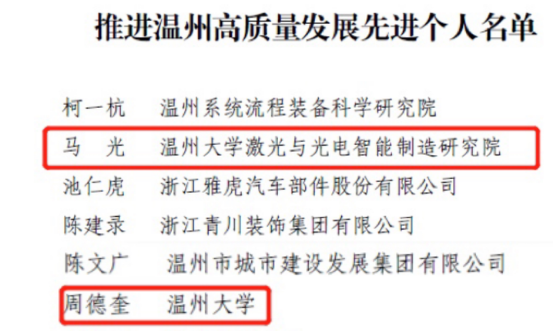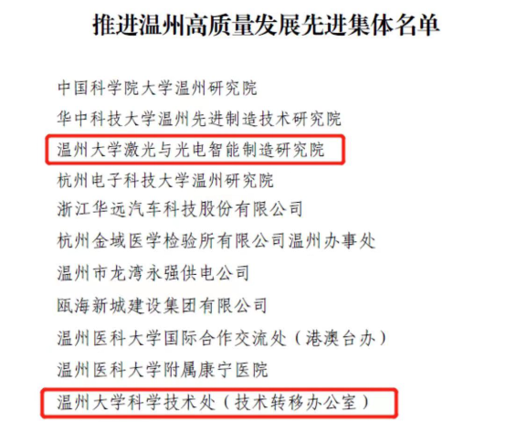 近日,中共温州市委员会通报表彰了2020年度“推进温州高质量发展先进集体和先进个人”,新澳门六合彩 科学技术处(技术转移办公室)和新澳门六合彩 激光与光电智能制造研究院荣获“推进温州高质量发展先进集体”,新澳门六合彩 党委校长办公室副主任周德奎和新澳门六合彩 激光与光电智能制造研究院院长马光荣获“推进温州高质量发展先进个人”。