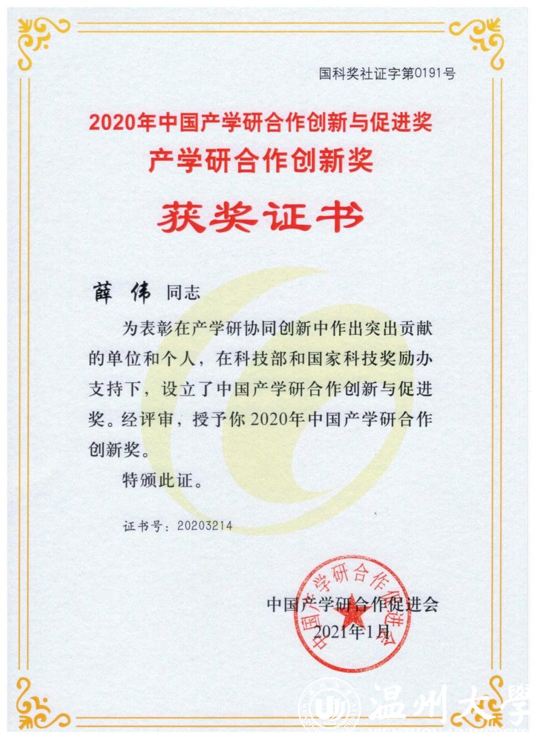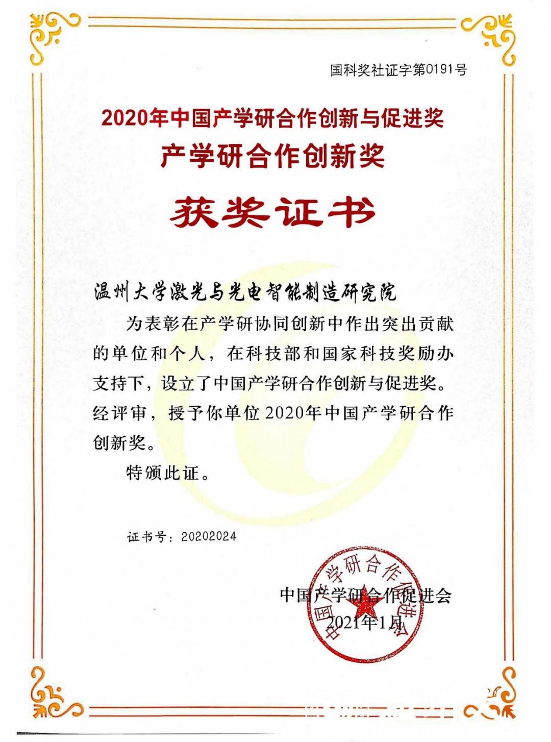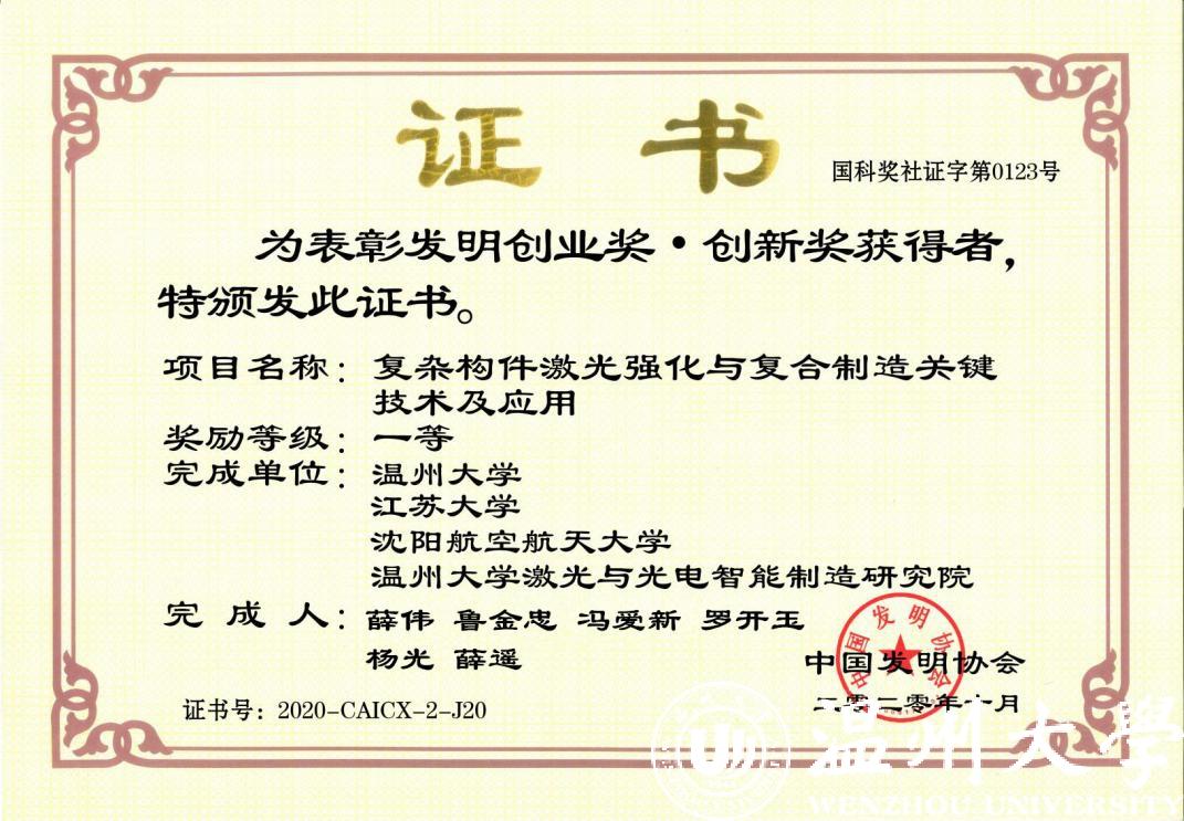 日前,中国发明协会和中国产学研合作促进会陆续公布了2020年发明创业奖·创新奖和2020年中国产学研合作创新与促进奖,其中由浙南科技城管委会和新澳门六合彩 共同创建的新澳门六合彩 激光与光电智能制造研究院斩获产学研合作创新奖(单位),研究院薛伟教授团队技术成果《复杂构件激光强化与复合制造关键技术及应用》获发明创业奖·创新奖一等奖,研究院创新团队薛伟教授获产学研合作创新个人奖。这一成绩见证了研究院经过四年来的发展,在产学研创新工作中又迈向了一个新的高度。