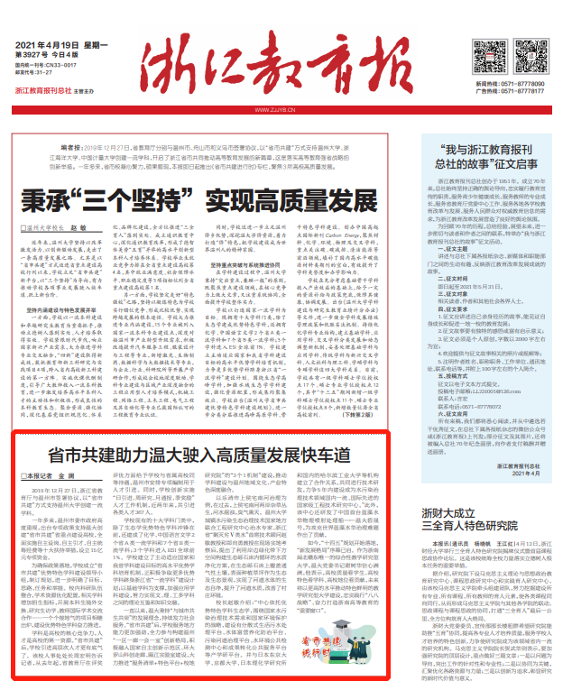 【编者按】4月19日,《浙江教育报》头版刊发新澳门六合彩 建设发展成果文章《省市共建助力新澳门六合彩 驶入高质量发展快车道》。文章聚焦新澳门六合彩 迈入省重点校以来学科与人才队伍建设等方面的特色与亮点,报道了新澳门六合彩 建设发展取得的斐然成果。现全文转载,以飨读者。