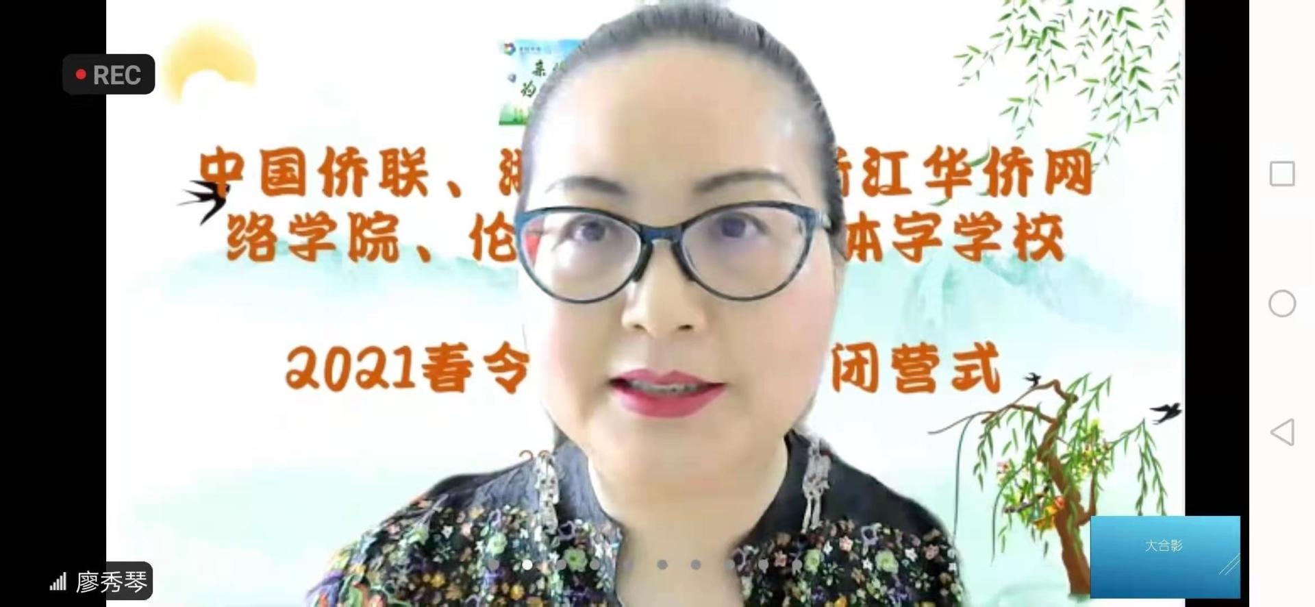 北京时间4月16日下午6点,浙江华侨网络学院和伦敦简体字中文学校共同举办浙江省华侨网络学院2021“亲情中华·为你讲故事”夏(春)令营活动第一期闭营仪式,标志着第一期活动取得了圆满的成功。伦敦普通话简体字学校校长廖秀琴主持闭营仪式。