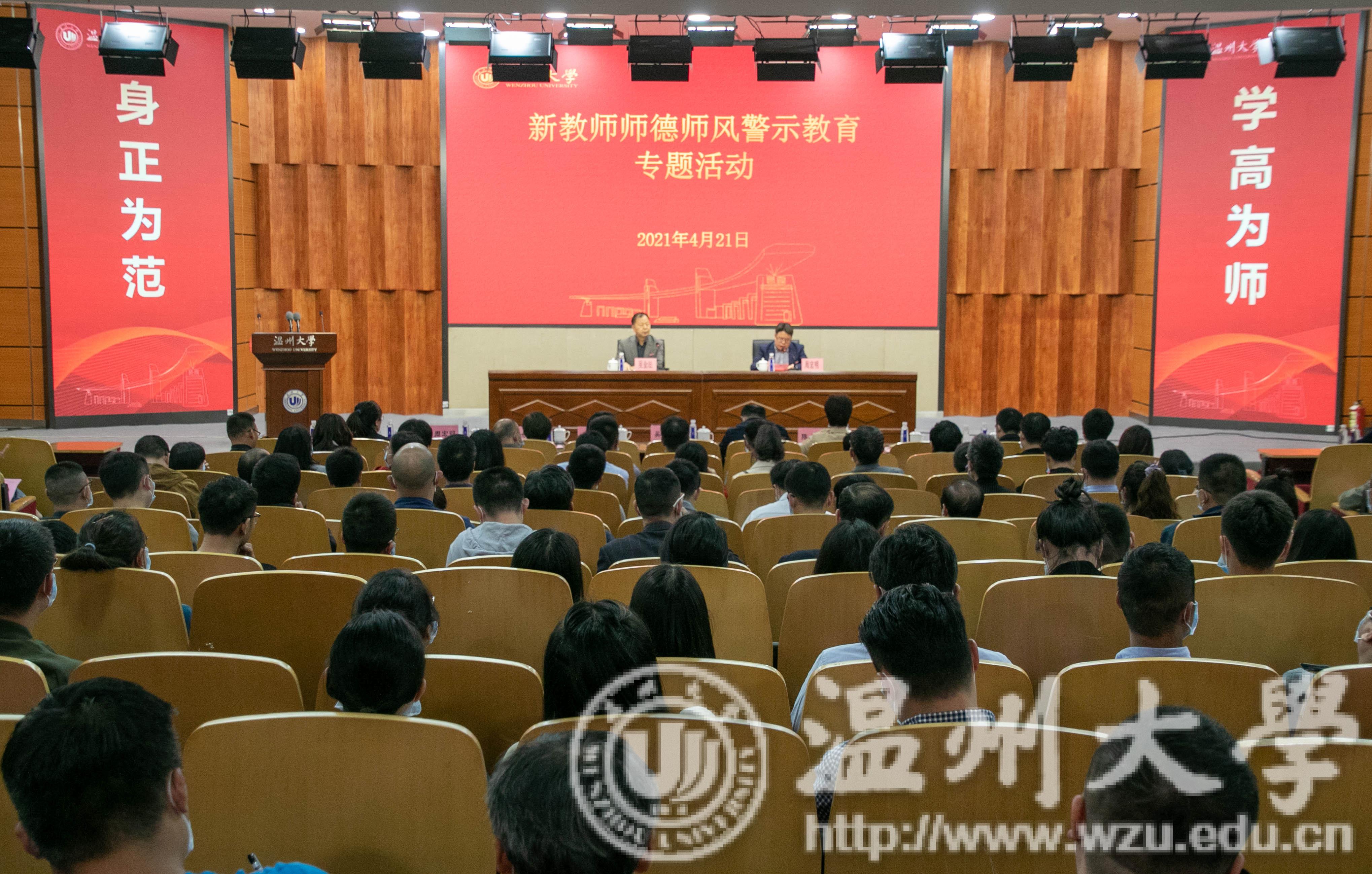 4月21日下午,新澳门六合彩 在岩松堂雁山厅组织新教师师德师风警示教育专题活动。校党委副书记吴金法出席,党委宣传部、纪检监察室、计财处、教师教学发展中心等相关职能部门负责人以及近三年来校的教师共260多人参加会议。