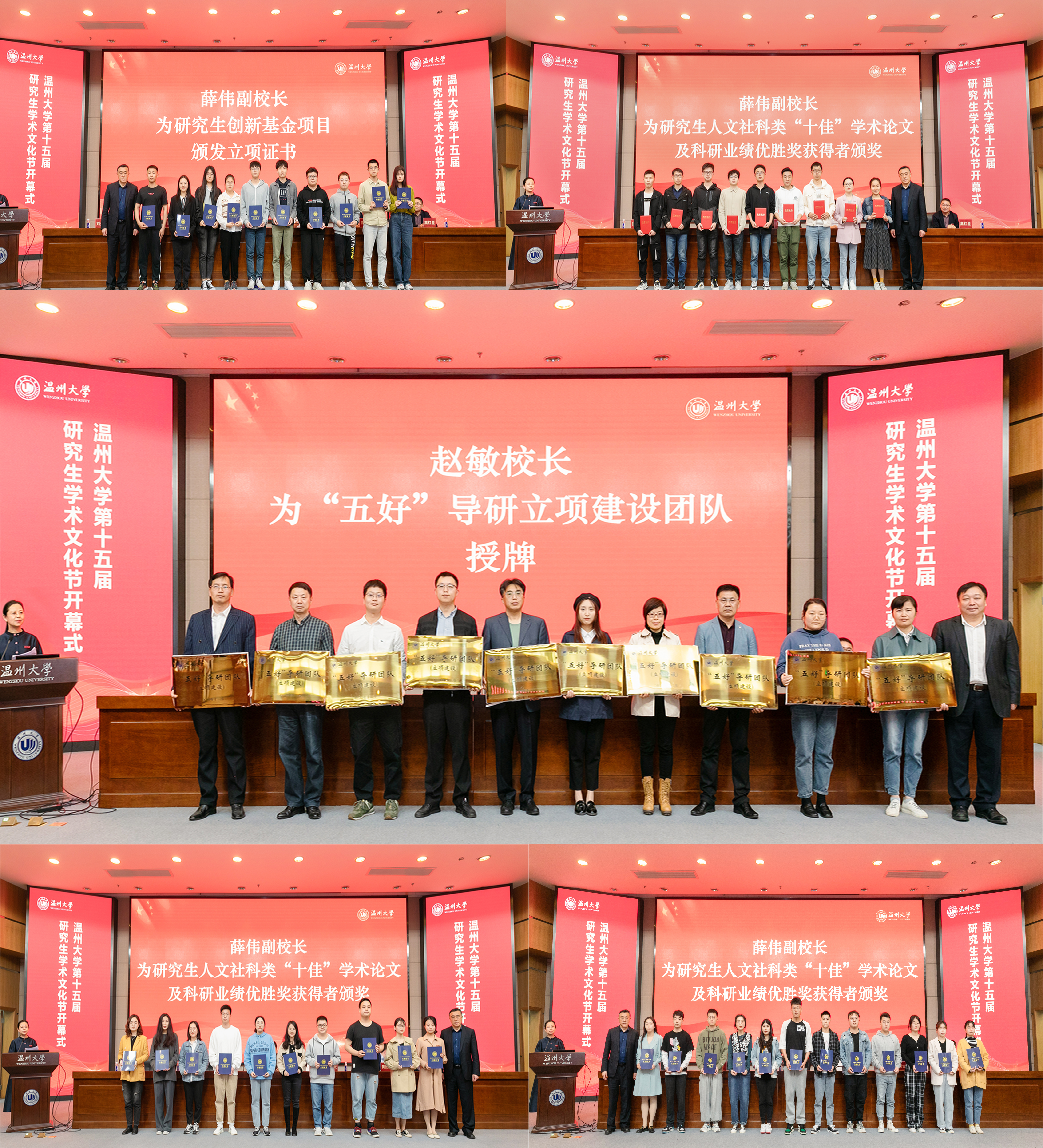 开幕式上校领导为“五好”导研立项建设团队授牌,为研究生创新基金项目颁发立项证书、为研究生人文社科类“十佳”学术论文和科研业绩优胜奖获得者颁奖。教育学院“云创课 研学行”课程设计导研团队、生命与环境科学学院分散式污水处理技术研究导研团队、2019级马克思主义理论专业研究生张剑宇、化学与材料工程学院2018级化学专业研究生王赢四个团队和个人做了典型代表发言。为鼓励更多研究生“留温”就业,浙江中公教育科技有限公司在新澳门六合彩 设立“中公·研究生留温就业奖学金”。