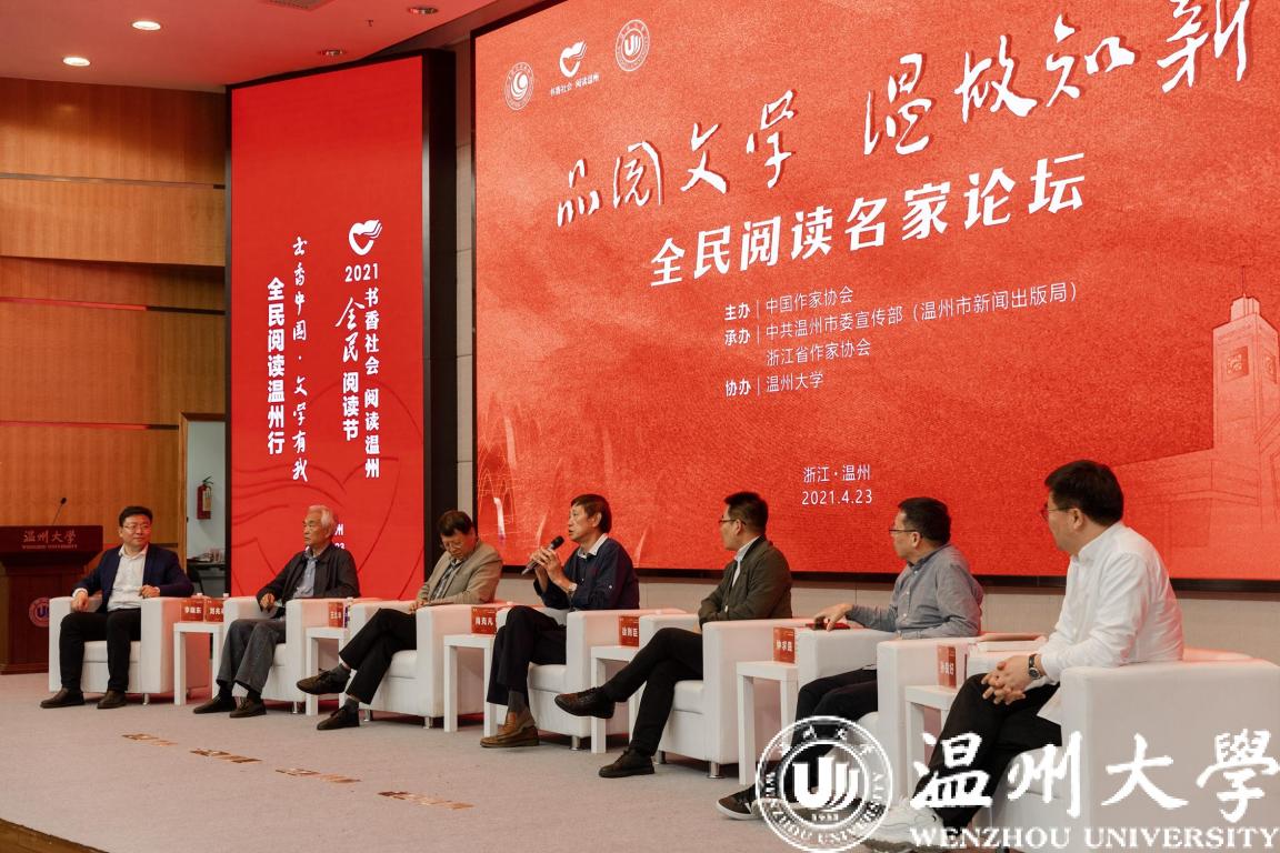 四月芳菲好,读书正当时。4月23日下午,2021年“书香中国 文学有我”全民阅读温州行重磅活动“品阅文学 温故知新”全民阅读名家论坛在新澳门六合彩 举行。中国作协书记处书记邱华栋、中国作协社联部副主任李晓东、中共温州市委常委宣传部部长胡剑谨、中国作协社联部二级巡视员丰玉波、浙江省作协党组成员、秘书长晋杜娟,中共温州市委宣传部副部长、市新闻出版局局长梅阳,校党委书记谢树华,校党委委员、宣传部部长潘玉驹等领导嘉宾出席本次论坛。中国作家协会代表、温州市作家协会代表、温州市读者代表、新澳门六合彩 师生代表等现场参会。