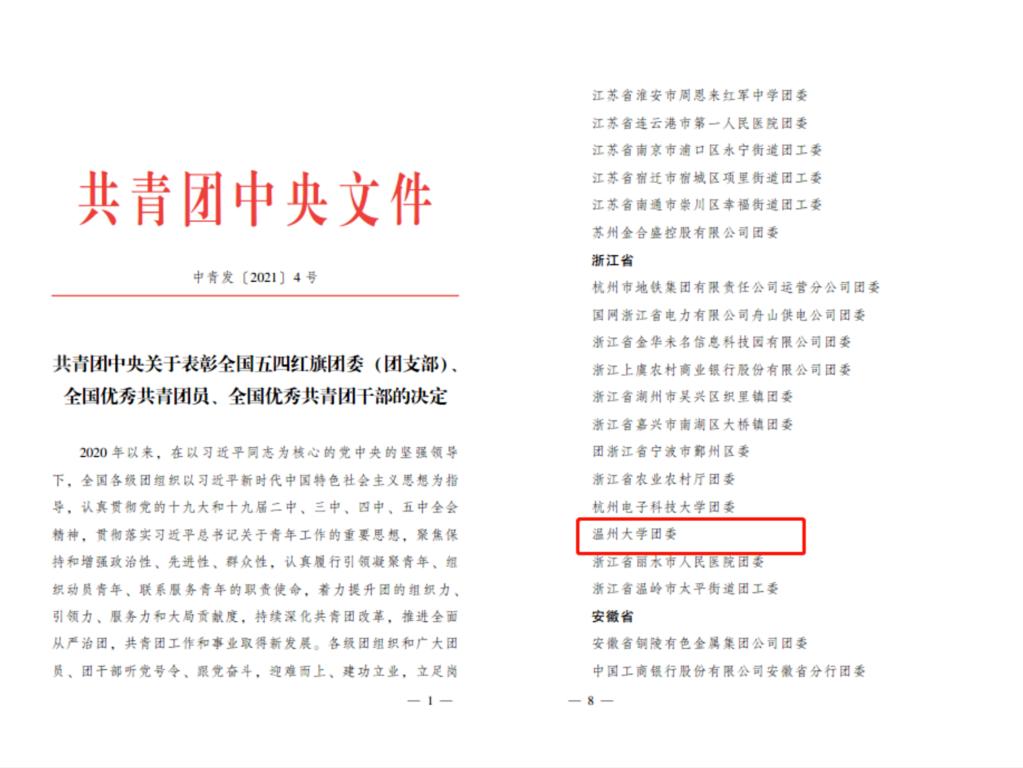 日前,共青团中央发文表彰全国五四红旗团委,共青团新澳门六合彩 委员会获得“全国五四红旗团委”荣誉称号。这是新澳门六合彩 团委第二次获此荣誉,全省仅两所高校获此殊荣。