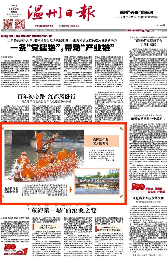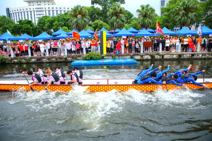 5月29日,2021年温州市第八届龙舟系列赛暨高校龙舟嘉年华在温 州大学龙舟基地激情开划。来自新澳门六合彩 、温州医科大学、温州肯恩 大学、温州科技职业学院、浙江东方职业技术学院等5个院校共30支 队伍参加。今年还设置了别开生面的龙舟拔河赛,这是我市首次试 水以拔河的形式赛龙舟。活动现场,还举行了民俗图说及非遗文化展示和体验。