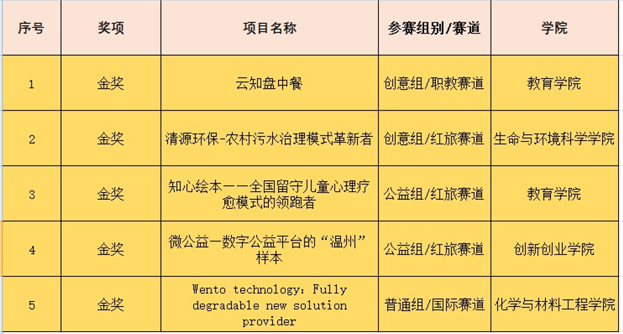 5项金奖中,《云知盘中餐》项目获得职教赛道金奖,《清源环保-农村污水治理模式革新者》《知心绘本——全国留守儿童心理疗愈模式的领跑者》《微公益—数字公益平台的“温州”样本》3个项目获得“青年红色筑梦之旅”赛道金奖,《Wento technology:Fully degradable new solution provider》项目获得国际赛道金奖。