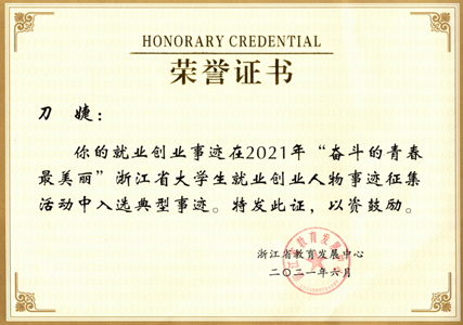 近日,2021年“奋斗的青春最美丽”浙江省大学生就业创业人物事迹征集评选结果正式揭晓,新澳门六合彩 2020届毕业生刀婕荣获“基层就业大学生典型人物”。